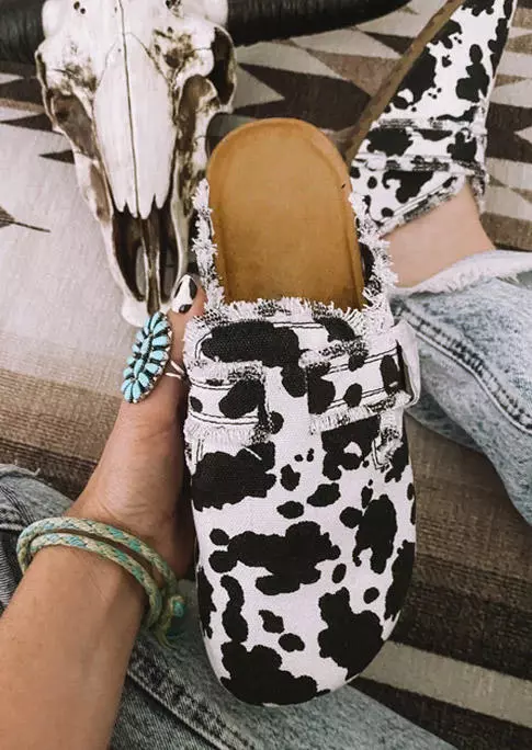 Cow Buckle Round Toe Slippers – White